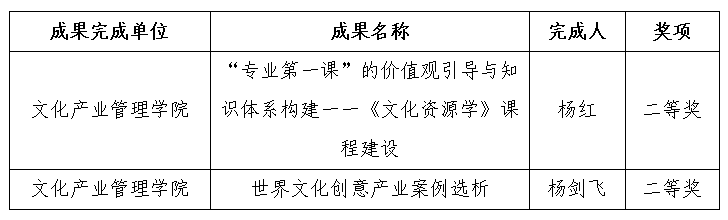 近日,中国传媒大学本科生院公布第十届本科教育教学成果奖获奖结果。我院杨红老师申报的“‘专业第一课’的价值观引导与知识体系构建——《文化资源学》课程建设”、杨剑飞老师申报的《世界文化创意产业案例选析》荣获二等奖。