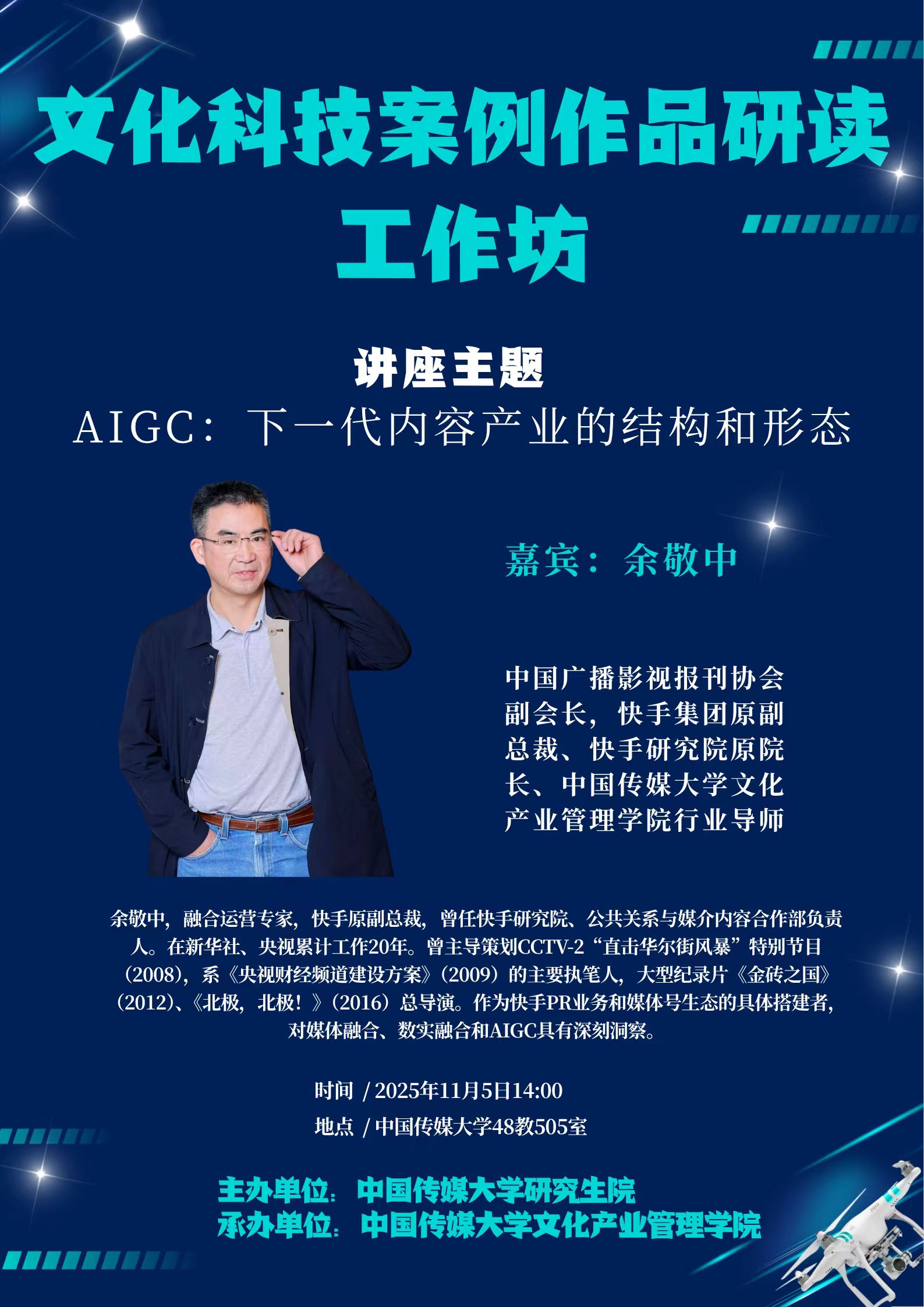 本期工作坊邀请到中国广播影视报刊协会副会长、快手集团原副总裁、快手研究院原院长、中国传媒大学文化产业管理学院行业导师余敬中老师作专题讲座《AIGC:下一代内容产业的结构和形态》。讲座聚焦于AIGC技术在传媒与文化领域中的应用实践,探讨人工智能驱动下内容生产、媒介生态与传播模式的创新变革,展望科技与文化融合发展的新趋势。