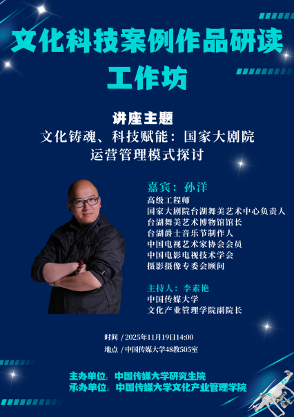 在数字化叙事迅速发展、公众文化需求不断提升的当下,国家级文化机构如何在公共性、艺术性与现代化运营之间实现系统化平衡?如何通过科技手段提升大型文化场馆的管理效能、艺术生产机制与观众服务模式?本期“文化科技案例作品研读工作坊”,我们邀请到来自国家大剧院的台湖舞美艺术中心负责人——孙洋老师,带来主题讲座“文化铸魂、科技赋能:国家大剧院运营管理模式探讨”,与大家共同深入分析国家大剧院的运营机制、创新路径与未来趋势。