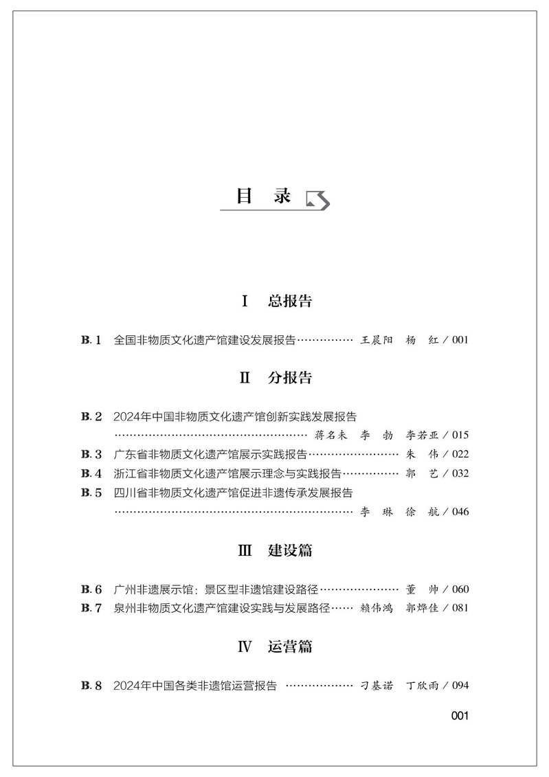 全书围绕“推动规范化发展、推广优秀实践经验、搭建多元对话平台、引导政策持续优化”的核心目标,通过数据整理、案例分析与实践总结,构建了包括总报告、分报告、建设篇、运营篇、传播篇、专题展览篇和交叉研究篇在内的七大部分研究框架,并在附录部分收录了全国代表性的非遗馆名录、媒体报道及年度大事记。
