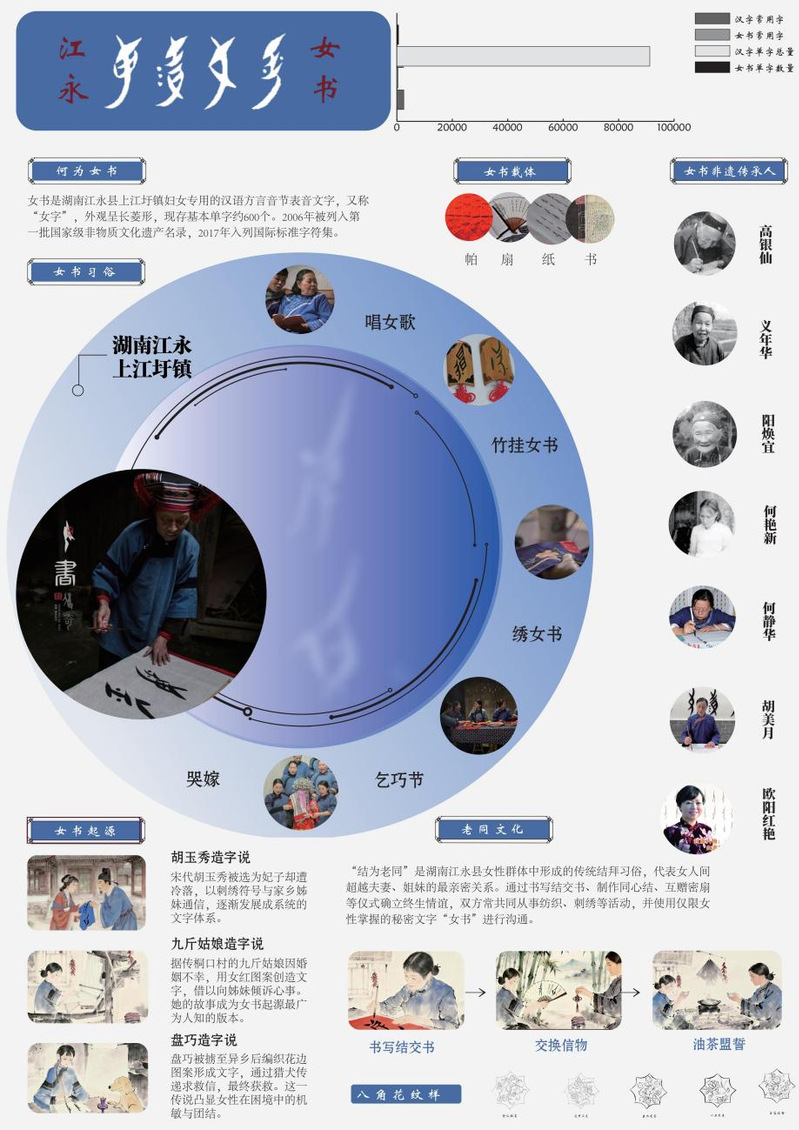 作品阐释:通过对非遗女书的源起传说、非遗传承人、女书习俗、老同文化等进行可视化呈现,对女书文化进行公益科普。