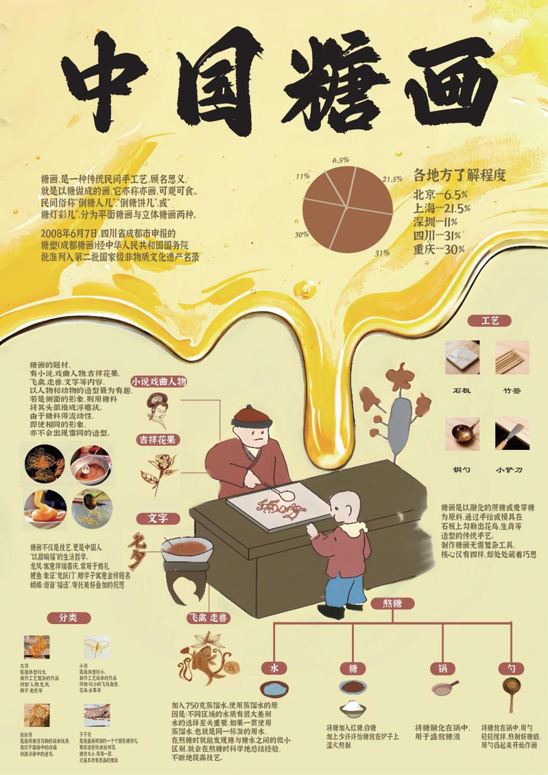 作品阐释:主要介绍了中国糖画作为一种传统的民间手工艺,在2008年6月被列入了国家级非物质文化遗产,分别将糖画的素材、工艺、分类、制作过程、工具使用等内容进行可视化展示。