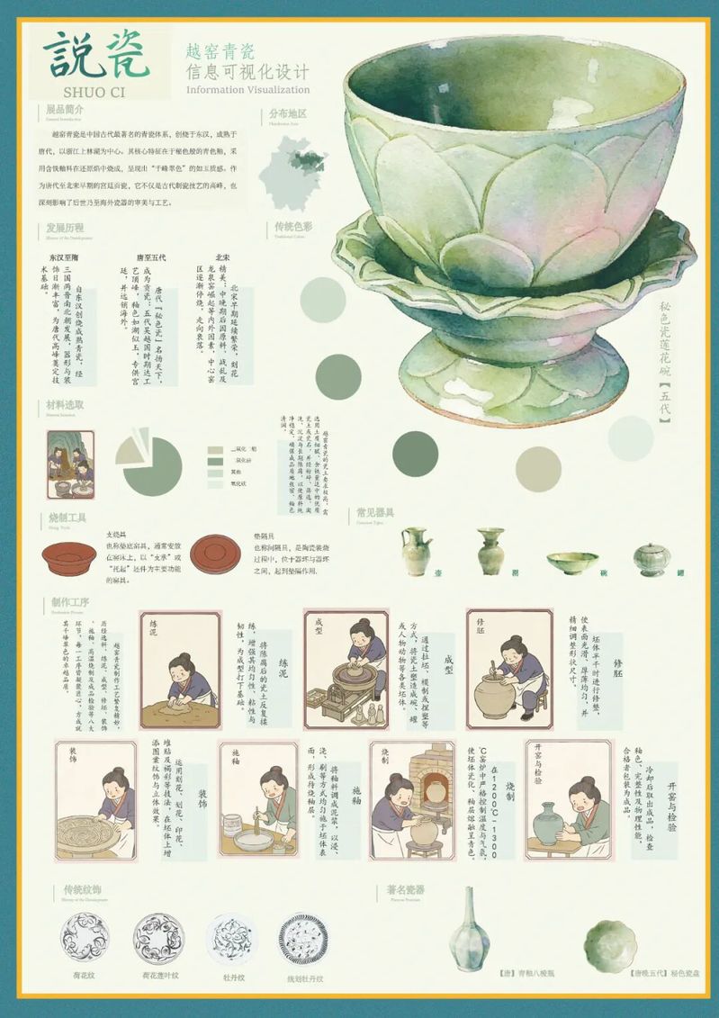 作品阐释:以青绿色调为核心视觉基底,贴合越窑青瓷釉色本貌,拆解其烧制工序、纹饰与分布,可视化呈现千年青瓷的工艺传承与美学意蕴。