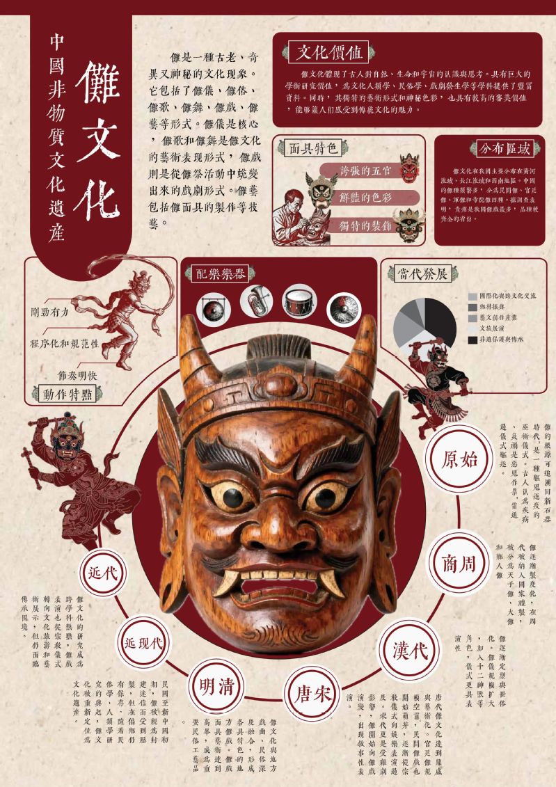 作品阐释:把傩面具作为视觉中心,其他部分分块拆解。色彩上选用红棕为主色调,搭配米色底纹,整体色彩设计的选用偏向契合中国传统民俗文化的视觉调性。