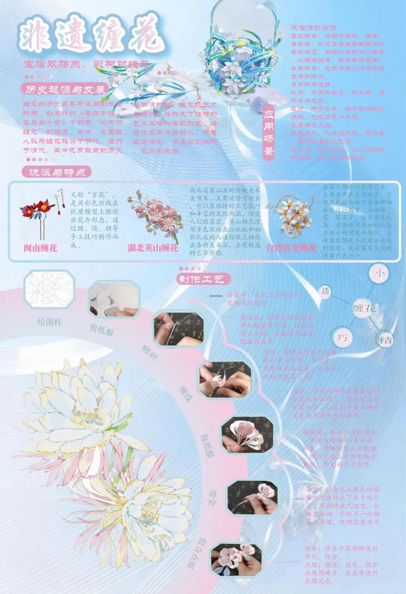 作品阐释:以缠花样式为视觉核心,通过对非遗缠花的历史起源与发展、应用场景、流派与特点、制作工艺的拆解,达成非遗缠花知识普及的目的。