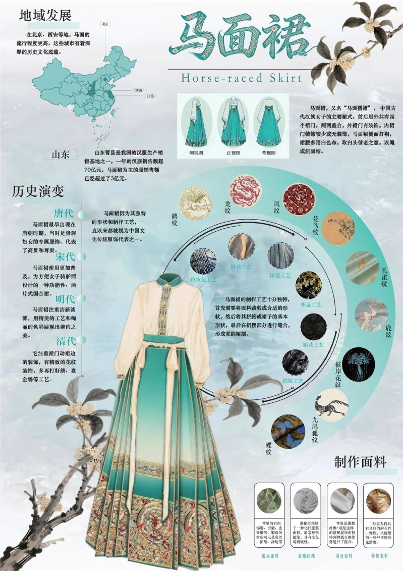 作品阐释:以青色为主色调,马面裙为视觉中心,通过对马面裙的历史发展阶段、传播地点和马面裙的制作手法、花纹样式进行阐述,介绍马面裙的由来和发展,普及非遗文化。