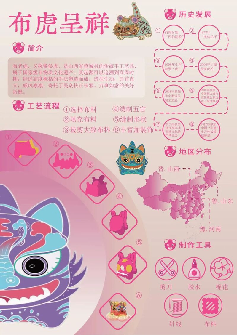 作品阐释:这是一张雅致的国风布老虎主题科普海报,系统梳理了布老虎的历史源流、工艺流程、地区分布与制作工具,搭配可爱的虎形插画与时间线,既展现了这项非遗技艺的深厚底蕴,也兼具实用的科普价值与审美体验。