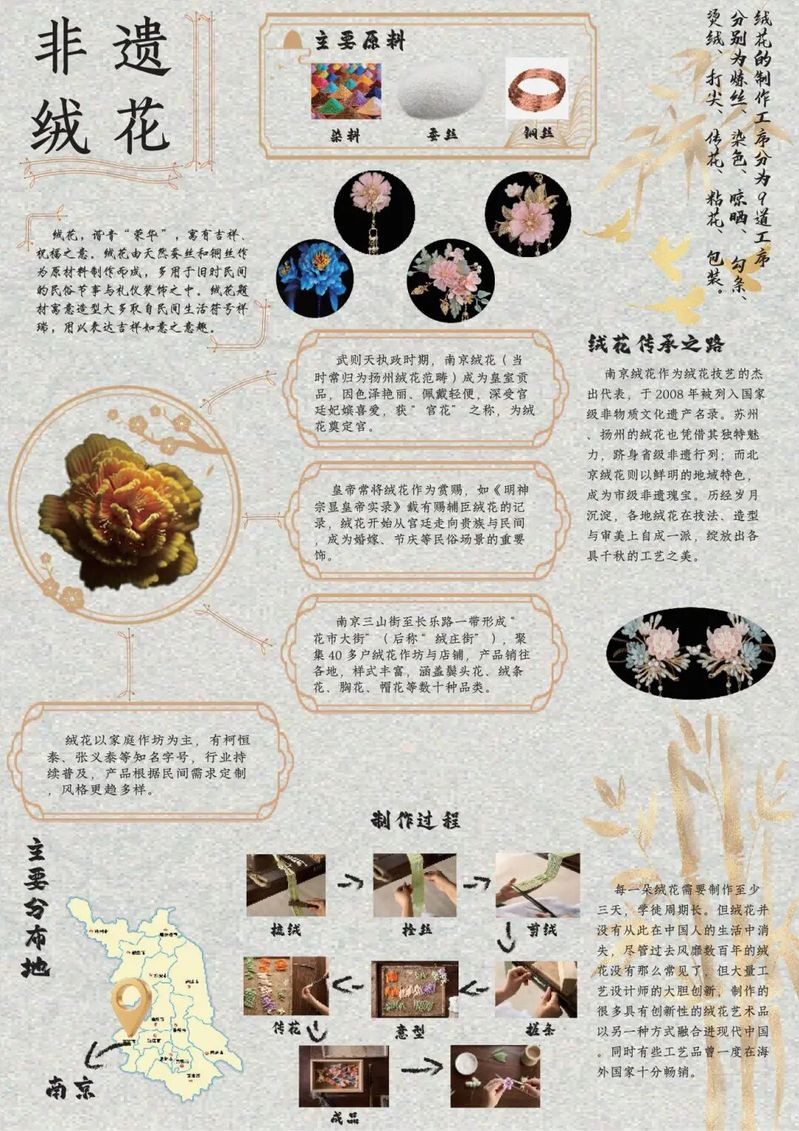 作品阐释:作品阐释:作品以淡黄色为主色调,通过展现绒花的发展历程、原料以及制作过程,体现非遗绒花的价值以及传承意义,希望能以此来推动普及以及传承非遗文化。