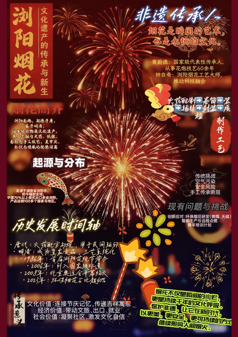 作品阐释:从烟花的起源 历史 工艺 传承 挑战等思索文化遗产的传承与新生 结合烟花爆竹元素 色彩以红、金、深蓝为主,象征喜庆、传统与夜空。