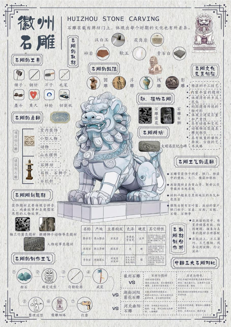 作品阐释:从内容梳理、视觉架构、设计手法三个维度搭建完整的信息传达体系,对徽州石雕的核心信息进行分层拆解,按照“基础属性-制作流程-文化价值”的逻辑链条,划分出石雕取材、工具、技法、应用、题材、文化特征等10余个信息模块。