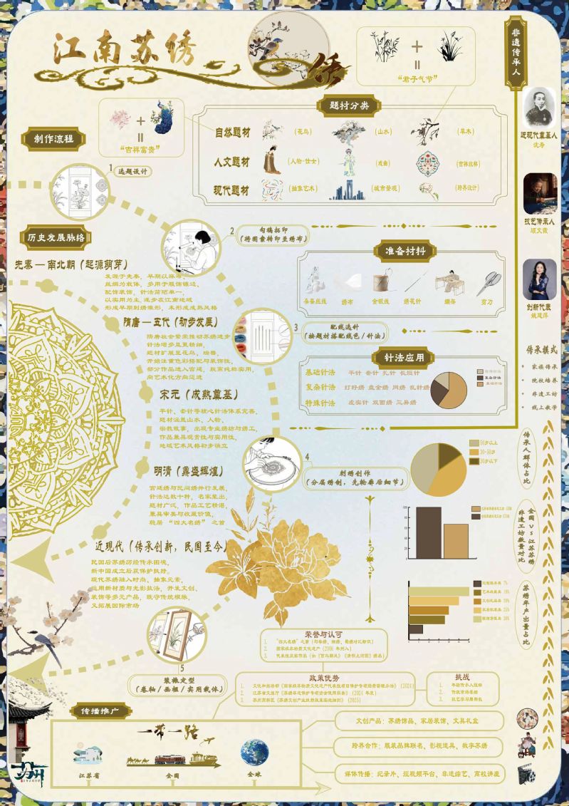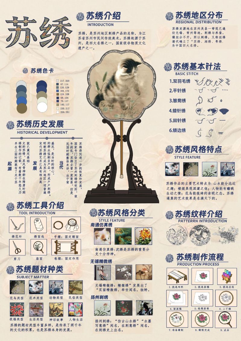 作品阐释:这是一张雅致的国风苏绣主题科普海报,系统梳理了苏绣的历史源流、核心技法、风格分类与制作流程,搭配色卡、工具图示与代表性纹样,既展现了这项非遗技艺的深厚底蕴,也兼具实用的科普价值与审美体验。