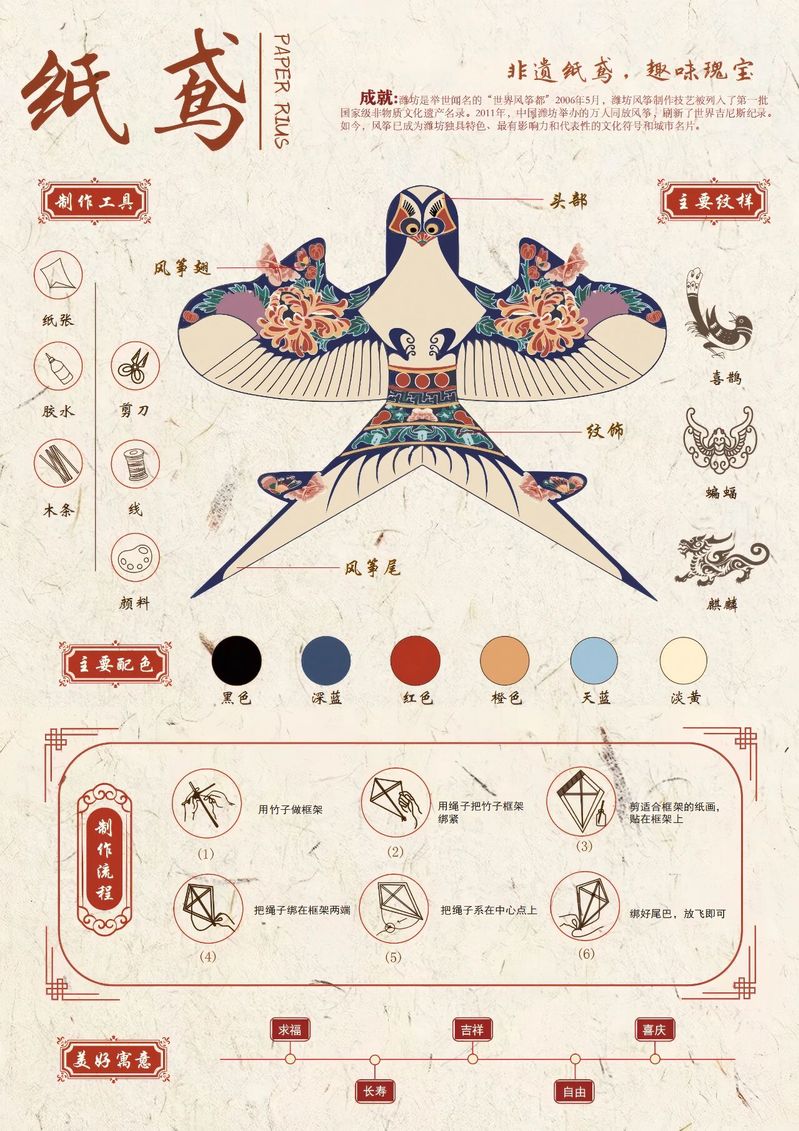 作品阐释:以可视化图表拆解潍坊纸鸢非遗技艺,将制作流程、纹样配色等传统工艺直观呈现,让非遗之美清晰可感。