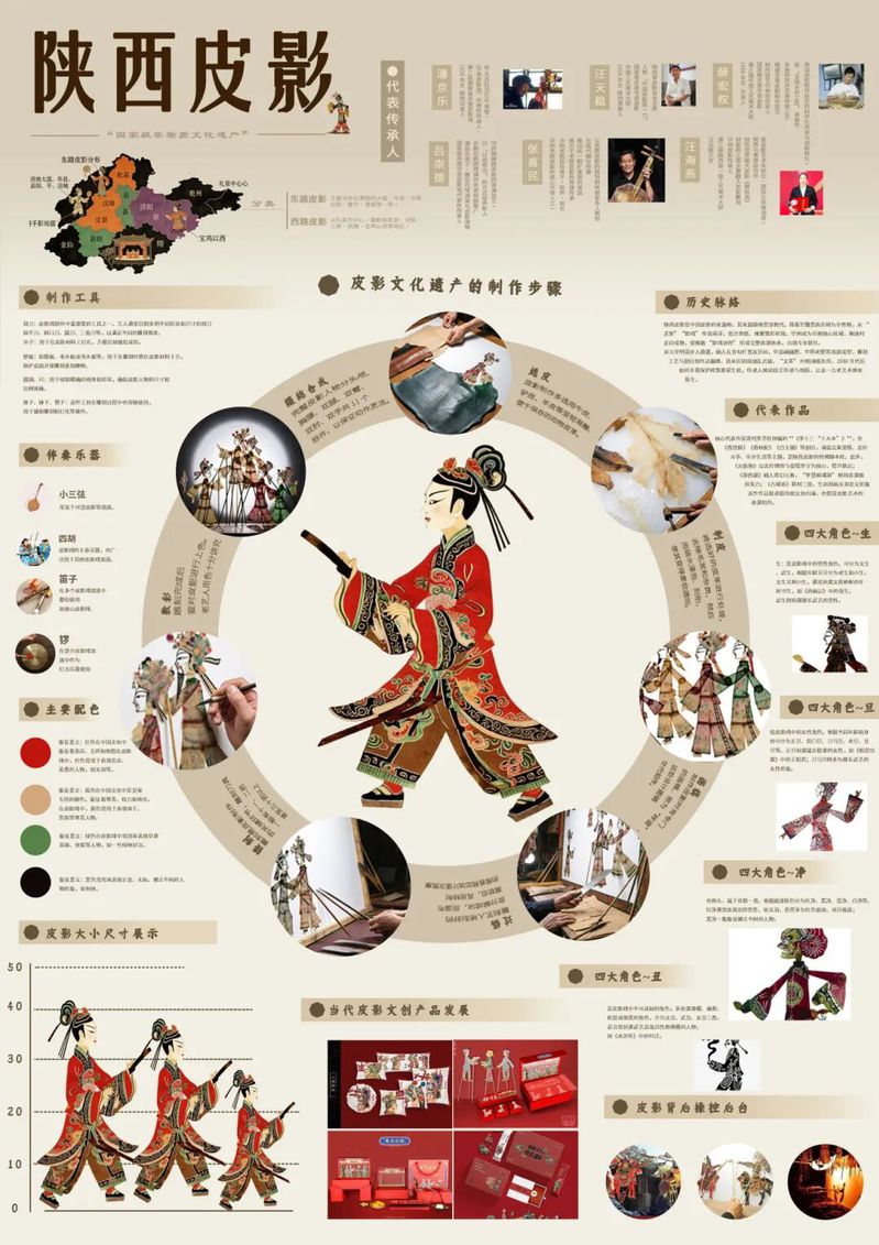 作品阐释:作品介绍陕西皮影分布区域、传承人及在现代的发展等相关信息,中间的圆环状设计旨在体现陕西皮影制作环节的环环相扣、源远流长。