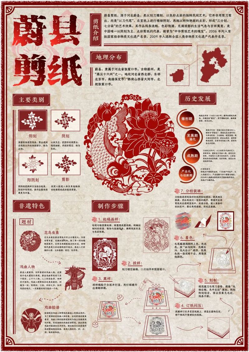 作品阐释:作品以红棕色为主色调,借由系统梳理蔚县剪纸的历史发展、特色、制作技艺,传递其文化价值彰显非遗魅力,致力于推动传统技艺的传承与发展。