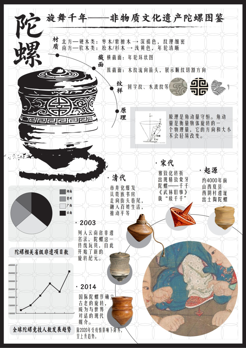 作品阐释:系统梳理陀螺的材质、原理与千年历史,致力于提高大众对该非遗项目的认知度。