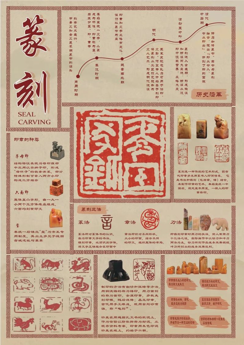 作品阐释:该海报以时间轴与图示结合,系统呈现篆刻艺术的历史演进、技法结构与文化意蕴。整体视觉以传统红、米色为主调,辅以回纹边框与古朴纹样。