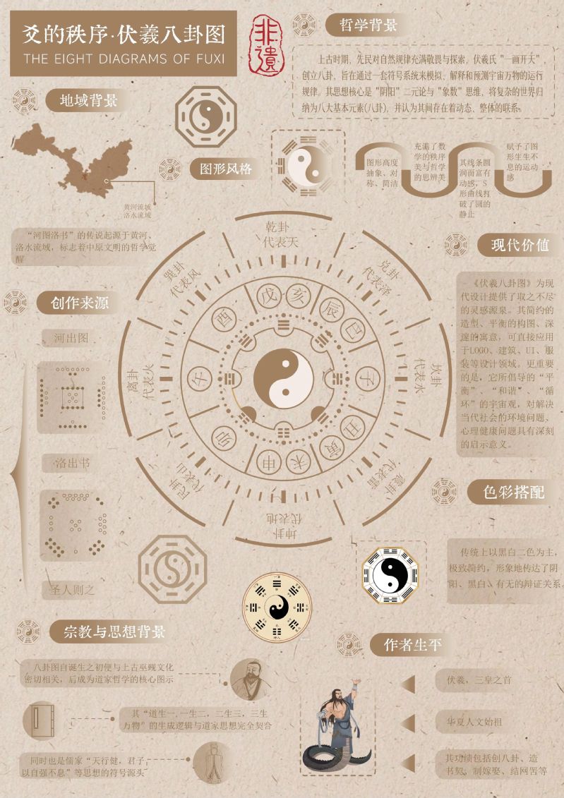 作品阐释:以伏羲八卦为核心阐述内容,在圆周将哲学背景、图形风格、创作来源、现代价值等信息进行呈现。