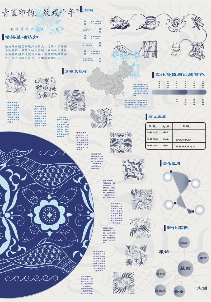 作品阐释:通过对蜡染的历史脉络、制作流程、分布地区、受众群体进行可视化阐释,对蜡染文化进行公益科普。