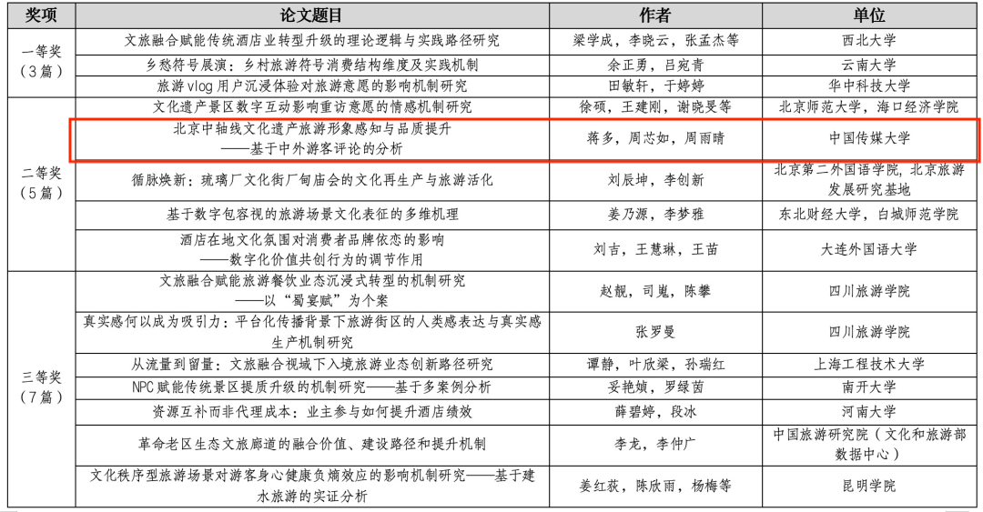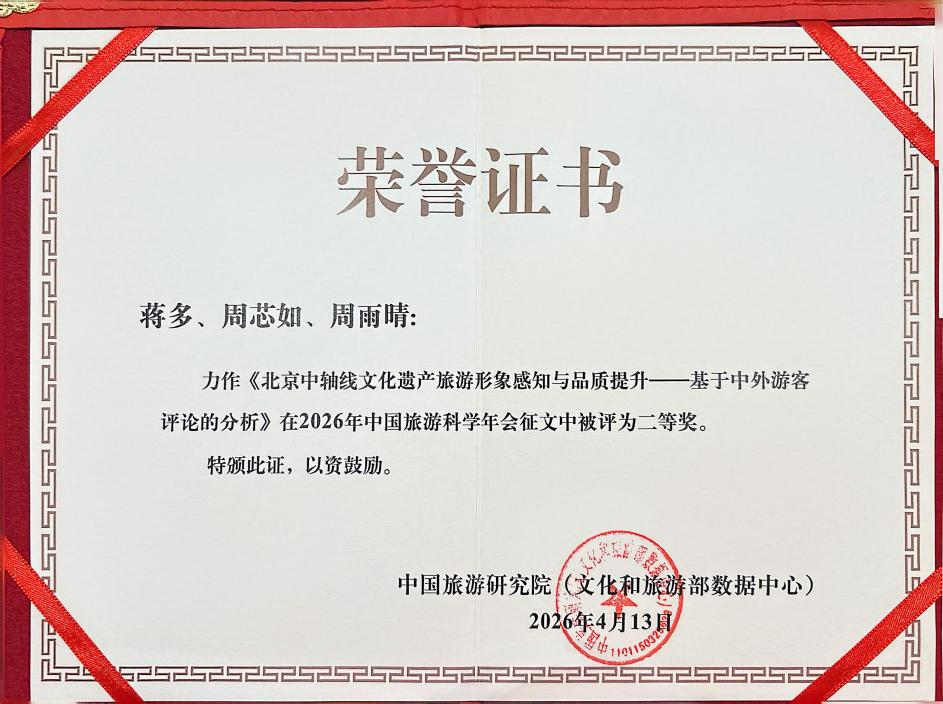 4月19日至20日,2026年中国旅游科学年会在北京隆重召开。经形式审查、通讯评审、会议评审等严格遴选,大会共评选出优秀会议论文15篇。由我院蒋多副教授、2023级文化产业管理硕士研究生周芯如与2023级文化产业管理本科生周雨晴共同完成的论文《北京中轴线文化遗产旅游形象感知与品质提升——基于中外游客评论的分析》喜获二等奖。